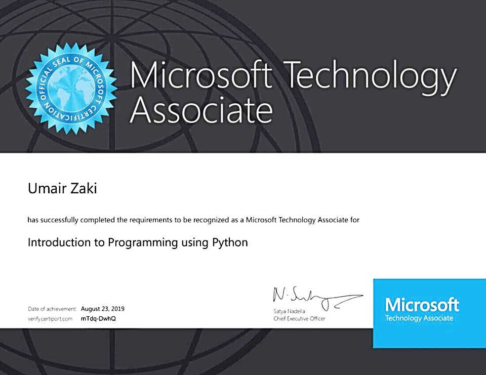 I had passed the Microsoft Technology Associate Certificate (MTA-98-381) Introduction to programming using Python with 89% marks on August 23, 2019.